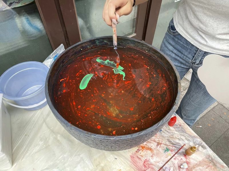 圖為實踐隊隊員在王老師的指導下體驗漆扇制作。 張佳怡供圖