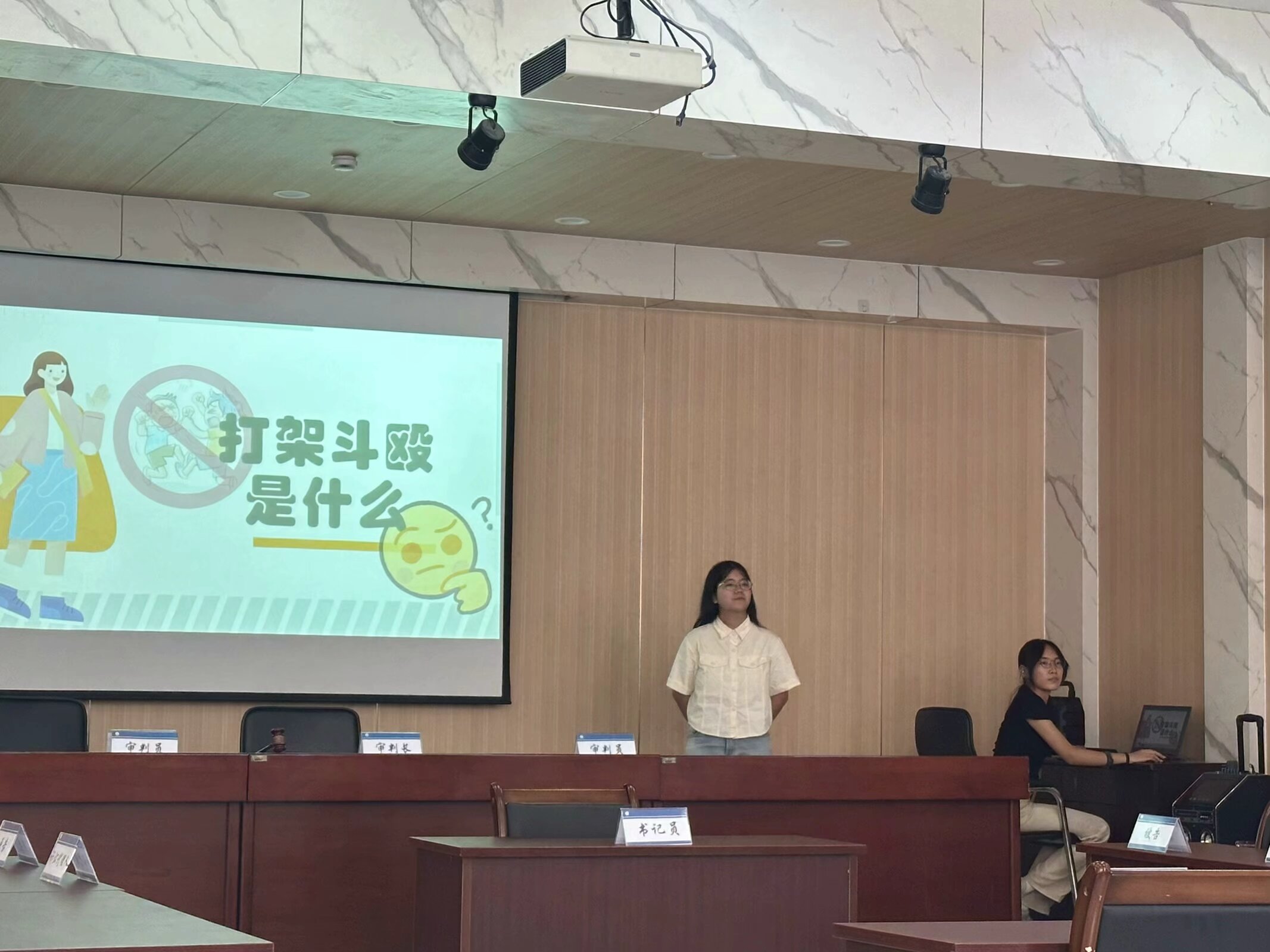 第三場模擬法庭的主題為“打架斗毆”。本案以希望小學嚴律己和王可憐兩位同學在教室課間休息時嬉鬧,結束后即將上課前,王可憐不慎被嚴律己從背后用手推后摔倒,導致王可憐的兩顆門牙磕到桌角后呈斜角式斷開。事發后原告王可憐提出訴訟,要求嚴律己一家和希望小學共同承擔賠償責任。在本次模擬法庭中,孩子們積極參與,認真完成了本場法庭辯論。