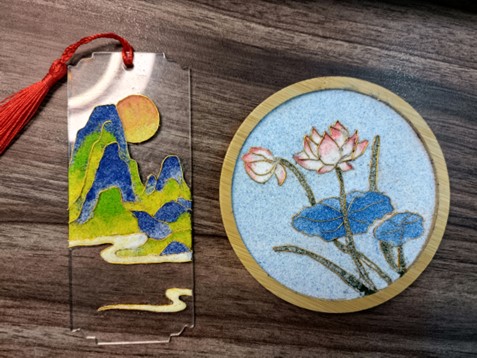 執絲為筆,以釉為彩。景泰藍掐絲琺瑯是中國著名的非遺技藝,起源于元朝,盛行于明朝,在乾隆時期達到發展頂峰。為使大家更好地了解這項技藝,徐若涵從掐絲琺瑯的歷史起源、發展過程、和制作工藝等方面帶同學們走進掐絲琺瑯。同學們聚精會神地聽著,對這一傳統工藝表現出了濃厚的興趣。在介紹完掐絲琺瑯的相關知識后,在實踐團成員的指導下,同學們親自動手體驗掐絲琺瑯的制作過程,通過掐、拉、繞、折等掐絲技巧把金絲黏在輪廓上;多次平均著色……經過兩個小時的精雕細琢,一幅幅色彩鮮艷、精巧細致的圖案逐漸成型。“這個書簽看著簡單,做起來才感覺很不容易。”在完成作品的制作后大家紛紛感嘆制作一件精湛工藝品的不易。