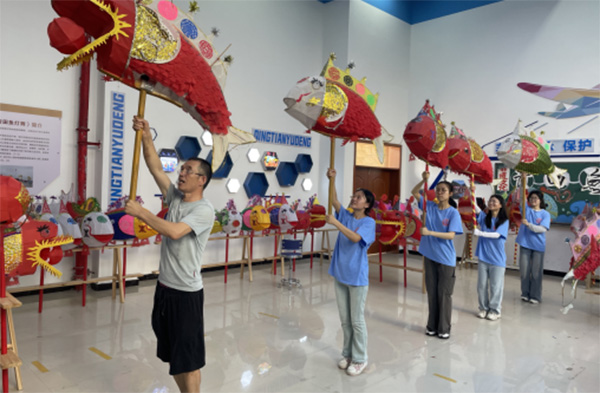 在結束專訪后,實踐團手執魚燈,向施老師學習魚燈舞的舞蹈技巧。“在舞魚燈時,眼神是最重要的,只有做到人、魚眼神融合,魚燈才能活起來。”施老師目光如炬,手里的魚燈一會起伏游動,一會左右擺動,一會上下翻躍,“這是一個協作的動作,后面的魚要時刻盯著你前面的那條魚,這樣隊伍才不會亂。”在施老師的耐心講解下,實踐團體悟要領,反復練習,不僅感受到了魚燈舞中人魚合一的美韻,也更加欽佩傳承人在非遺文化發展中熱忱的態度和堅守的精神。