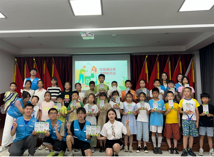 圖為實(shí)踐成員與小朋友宣傳垃圾分類合影 王欣 供圖
