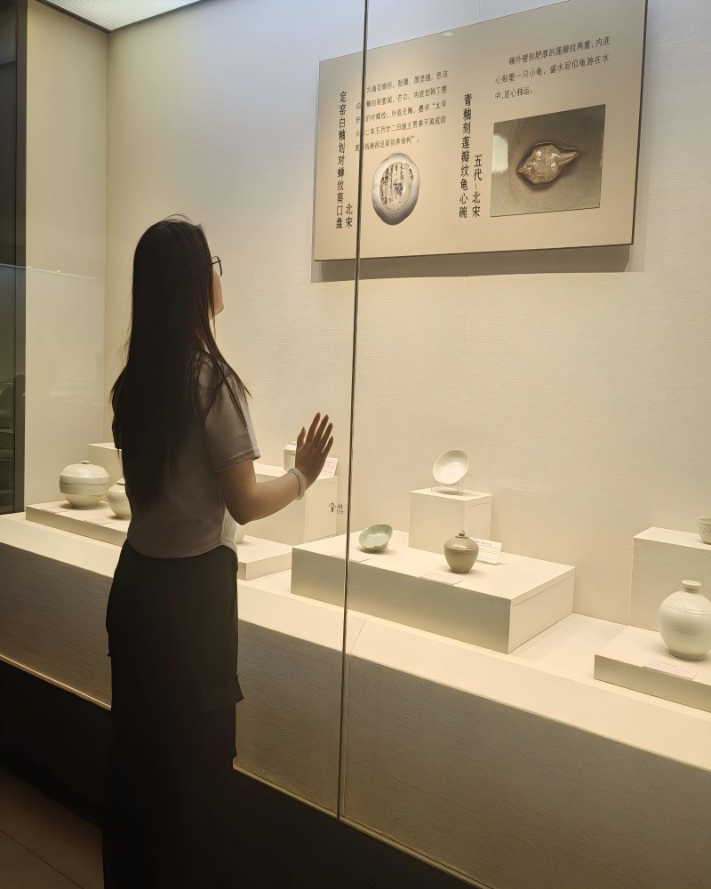 在此次實踐之前,我對于定瓷的了解僅限于歷史課本中在宋朝對于定瓷寥寥幾筆的描述—是宋朝五大官窯之一。在實地實踐之前,也僅僅通過文字和圖片感受定瓷的魅力,完全沒有見到透明的展柜中、明亮的燈光下如皓月當空般那一抹白來得更為震撼。那留白的地方,似乎蘊藏著最深沉的光芒。讓我真正感受到了什么是“定州花瓷甌,顏色天下白”。