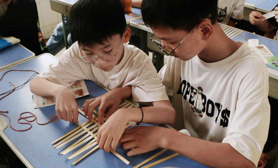 在張宇老師的耐心指導下,孩子們開始小心翼翼地編織著自己的龍舟。從最初的生疏笨拙,到后來的熟練自如,每一根竹篾條的穿插,每一條繩子的纏繞,都凝聚著孩子們對傳統文化的理解與尊重。他們或低頭沉思,或相視一笑,共同探索著竹編藝術的奧秘,享受著創作帶來的樂趣。