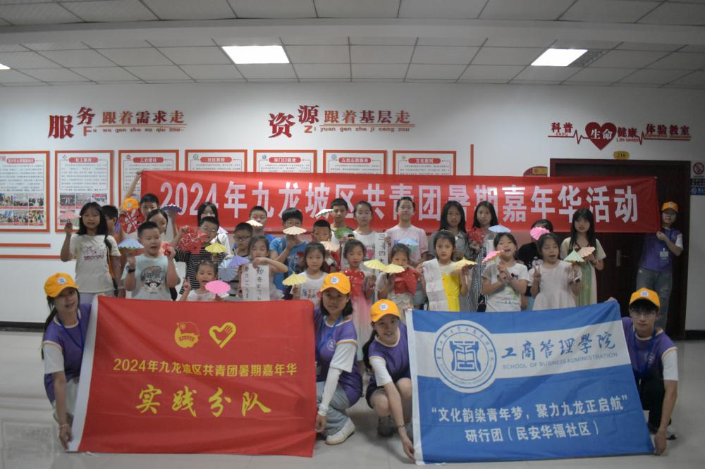 為使廣大青少年能深入接觸和理解中國傳統文化的豐富內涵和獨特魅力,同時激發青少年們的創造力和想象力。重慶工商大學工商管理學院“文化韻染青年夢,聚力九龍正啟航”研行團成員于2024年7月16日前往九龍坡區民安華福社區開展主題為“蜀韻傳千年,安全伴‘童’行”的青少年之家活動。
