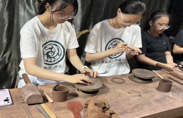圖為團隊成員體驗紫砂陶制作流程。中國青年網通訊員 張禾 供圖
