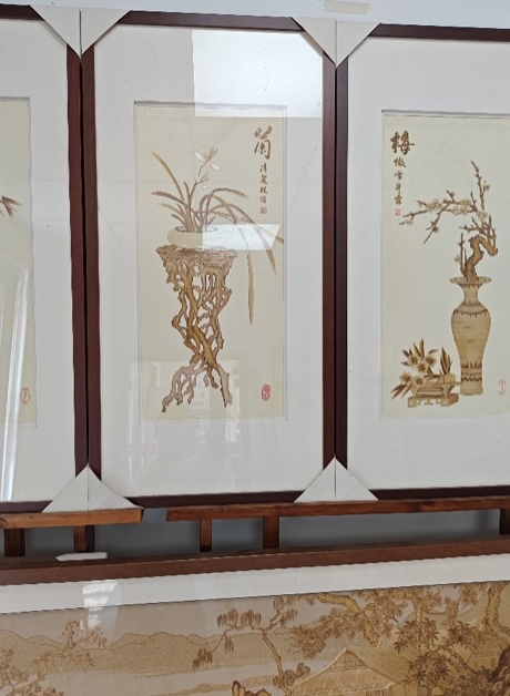 可惜的是,麥稈畫的制作對于細節要求不可謂不大,由于傳承人的時間安排問題,實踐隊員無法目睹一幅完整的作品誕生,但即使只是半成品也足以令人驚嘆。麥稈畫這一古老而獨特的民間藝術,被稱為“中華一絕”,不只是適用于客廳、臥室等房間裝飾,還成為了富有特色的文化禮品,其精湛的工藝和深厚的文化內涵,使之在人際交往中傳遞著獨特的情感和祝福。在之后的時間里,傳承人還向實踐隊員們展示了許多自己制作麥稈畫的一些細節處理,算是彌補實踐隊員未能目睹一副完整作品誕生的遺憾。