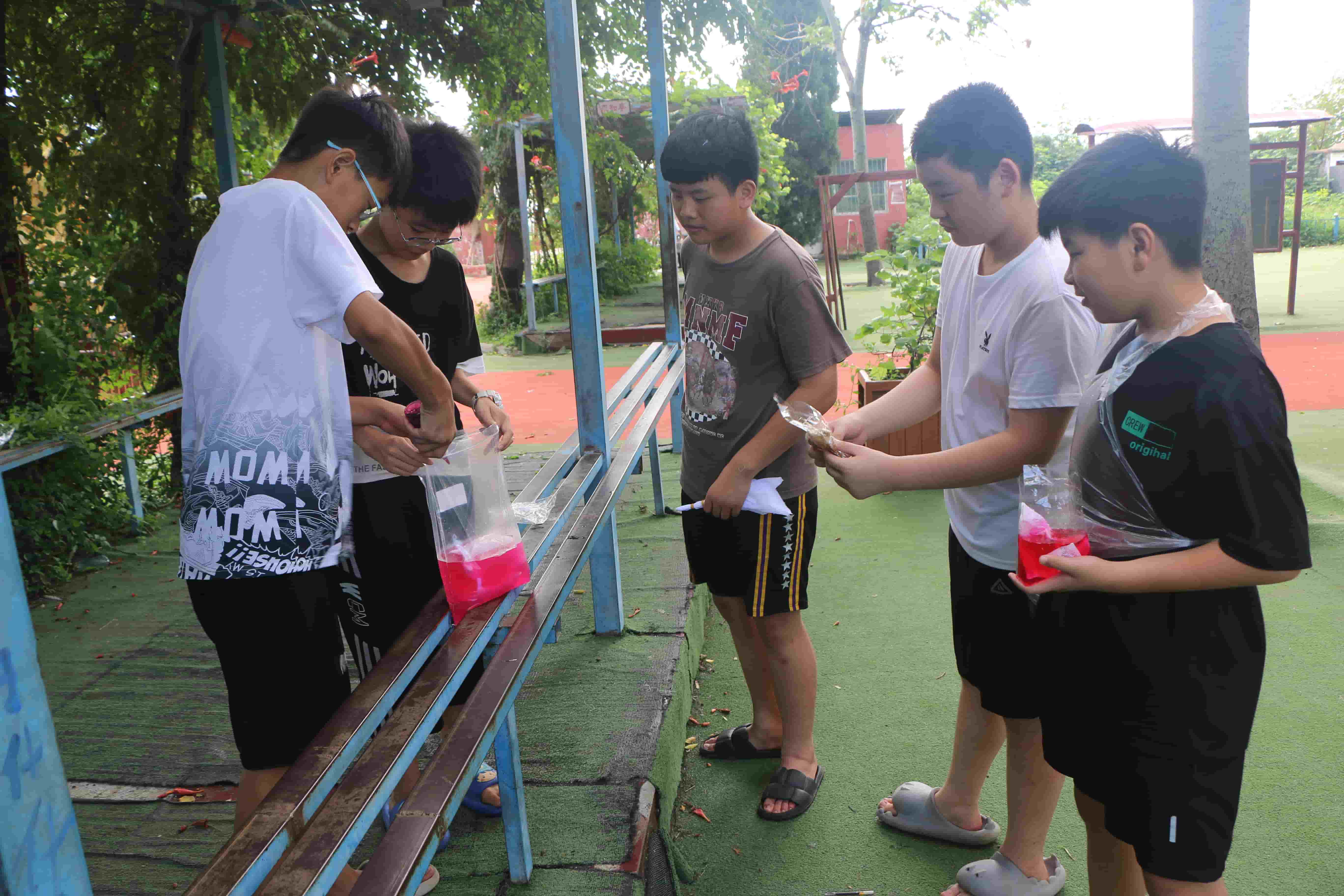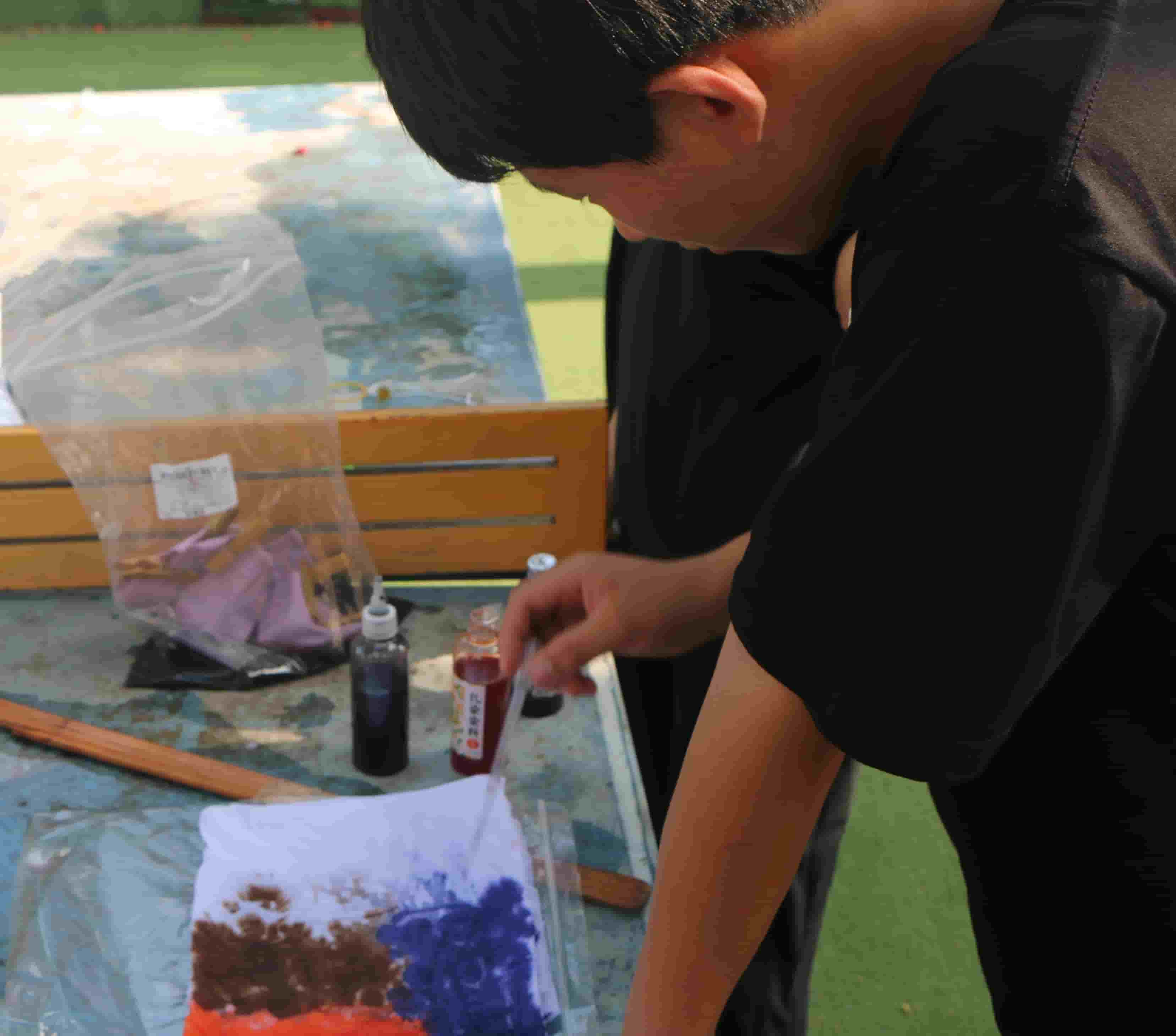扎染制作,創意無限在張宇老師的指導下,學生們興奮地投入到扎染制作中。他們或獨自創作,或結伴討論,將方巾折疊、捆綁、夾持,用皮筋固定出各種形狀,再小心翼翼地滴上色彩斑斕的染料。每一步都充滿了對未知的好奇與期待,每一幅作品都是獨一無二的藝術品。