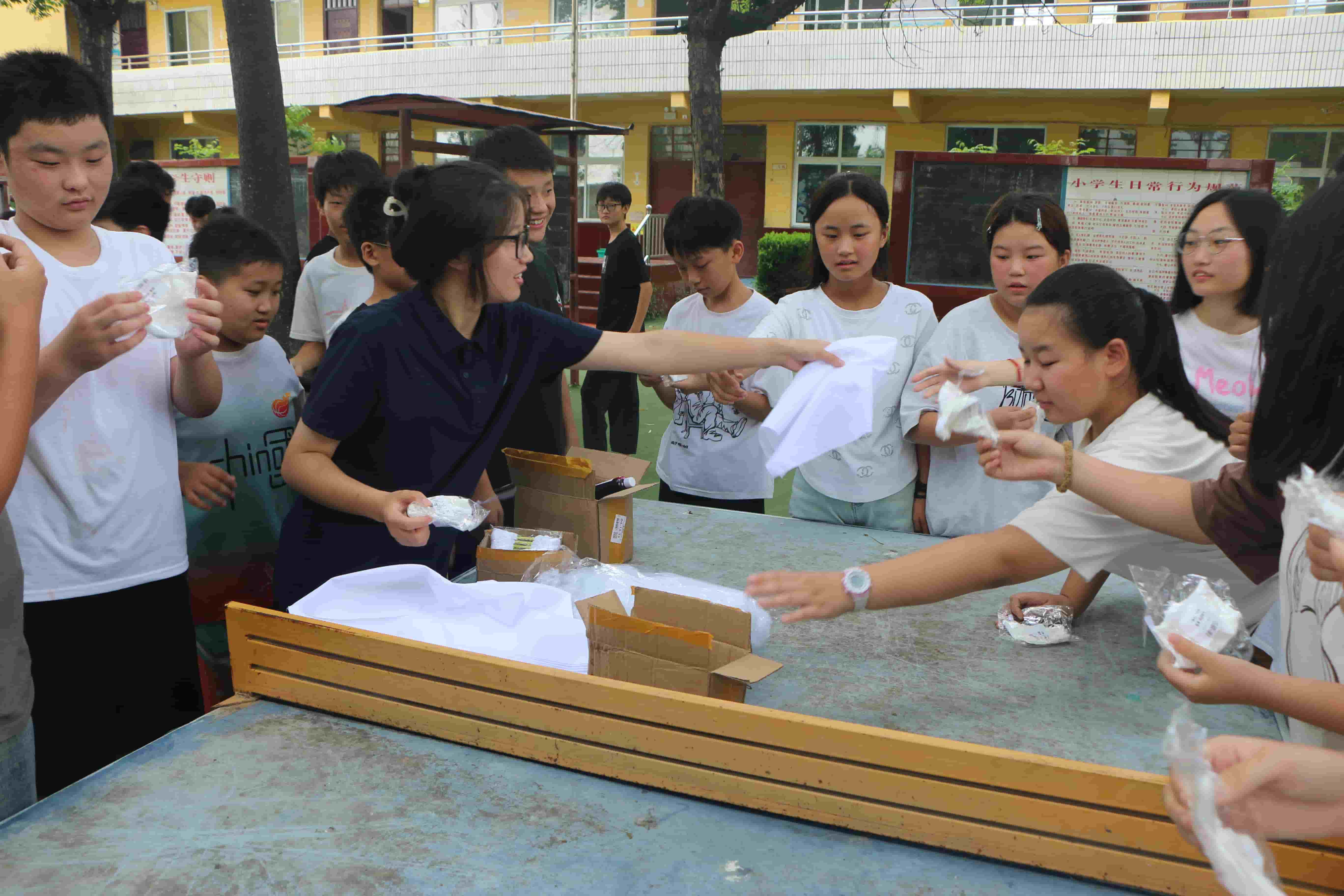 分發物資,安全第一為了確保每位學生都能安全、順利地完成扎染作品,實踐團為學生們準備了齊全的扎染材料包,包括染料、方巾、星形扎染白胚、PE袋用于扎染制作,以及手套、圍裙等防護用品,確保學生在創作過程中免受染料污染。此外,滴管、玻璃珠、木片、竹夾子、皮筋等輔助工具也一應俱全,為創意發揮提供了無限可能。
