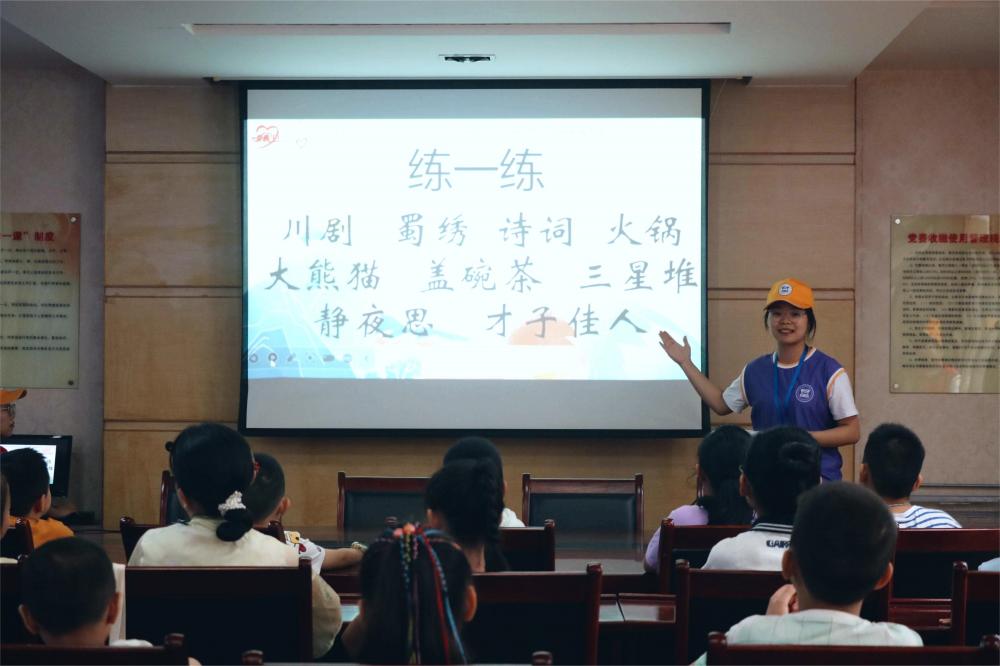 7月15日,研行團成員為小朋友們開展了巴蜀文化互動課堂,該課堂以文化講解和積分制互動游戲的形式展開。在講解環節,研行團成員分別給小朋友們講解了巴蜀的人文地理、優良傳統文化和特色文化;在互動游戲環節,研行團成員帶領小朋友們進行了“正話反說”、詩詞飛花令、根據蜀繡說出四字成語等互動游戲。在課堂的最后,研行團成員為小朋友們頒發了獎品。這天的活動初步建立了小朋友與巴蜀文化的溝通橋梁,為小朋友們更進一步體會巴蜀文化奠定了基礎。
