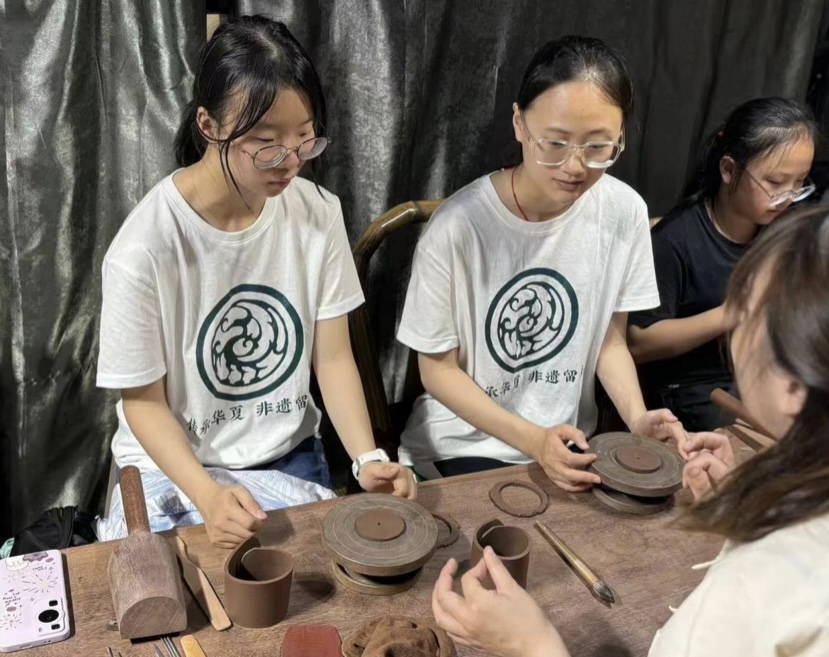在非遺傳承人的引領下,實踐隊員們也親身體驗了整個制作流程。他們發現制作紫砂壺并不容易。打泥、揉捏、拍打,每一道工序都需傾注全力,汗水浸濕了衣衫,手指因長時間勞作而微微顫抖。劃線、圍形,每一個細微的動作都要求精準無誤,稍有不慎便前功盡棄。更不必提那精細的雕刻,仿佛是在針尖上跳舞,每一刀都需小心翼翼,屏息凝神。制作紫砂壺的艱辛,讓實踐隊員們深刻體會到了匠人的不易與執著。雖然技藝尚顯生疏,但那份對傳統文化的敬畏與熱愛卻愈發濃烈。