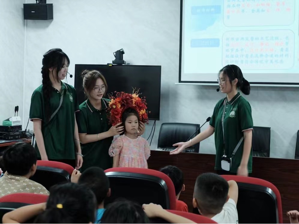 為了傳承中華優秀傳統文化、弘揚民族精神,2024年7月19日上午,閩南理工學院教育學院宣講隊到坑東支教點進行簪花文化的進課堂活動。通過前期的學習和查找資料,宣講隊員們依次向學生們介紹簪花的文化起源、種類以及文化意義。其中,宣講隊員們仔細講解了簪花的制作工藝,采用語言文字與簪花圍實物相結合的形式,為學生們進行講解。宣講隊員們進行課堂小互動,模擬簪花過程,并且邀請學生們上臺體驗并且為他們拍照。在宣講簪花文化過程中,宣講隊員們積極與學生進行互動,解答學生們的疑惑,讓學生們更清晰地了解到簪花文化的歷史價值,體驗到簪花文化的文化魅力。