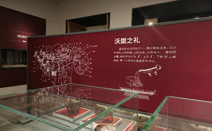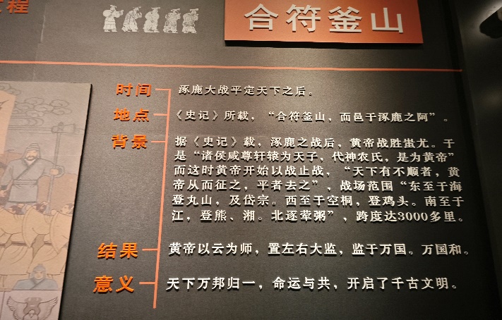 三、史書層層 走進(jìn)博物館團(tuán)隊(duì)成員又來到涿鹿博物館,三角形的建筑獨(dú)居特色,象征著三祖交匯,在工作人員的帶領(lǐng)下,團(tuán)隊(duì)成員參觀了涿鹿從炎黃時(shí)期到現(xiàn)代的歷史種種:祭祀古器斑駁,歷史記載永恒,其中,沃盥之禮是重要的祭祀儀式,盥洗是古代儀禮之一,用水使身潔凈,以示對神對人的恭敬。以匜注水,以盤接水,二者相互配套。上下二者甲骨文相合,像一只手放在盆里承水沖洗。團(tuán)隊(duì)成員了解到阪泉之戰(zhàn)、涿鹿之戰(zhàn)等記載在歷史課本上的重要?dú)v史事件,成員深深體會到這些古文物所承載的歷史之悠久與厚重,仿佛穿越千年,再次來到這片土地上。