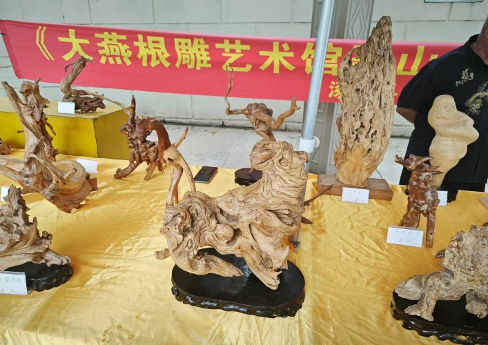 與工作人員交談得知,當(dāng)?shù)鼐皡^(qū)文創(chuàng)仍以簡單的紀(jì)念幣、明信片為主,并未發(fā)展出具有黃帝城特色的成熟文創(chuàng)產(chǎn)品。因?yàn)榈昝婢S修的緣故,團(tuán)隊(duì)成員未能參觀文創(chuàng)商店,而值得一提的是,在景區(qū)門外有售賣根雕藝術(shù)的商販,商品形態(tài)各異,以山海經(jīng)等古籍里神獸與黃帝麾下神將形象為模板進(jìn)行,栩栩如生。可見外界文創(chuàng)業(yè)較為成熟,且具有當(dāng)?shù)靥厣俜轿膭?chuàng)店并未創(chuàng)新,兩者并未緊密結(jié)合。