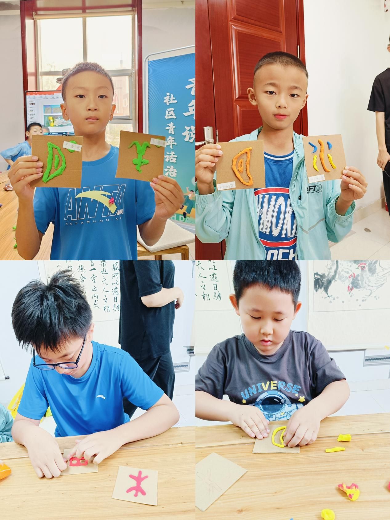 不以紙筆定能力,雖無紙筆墨飄香。經過短暫的休息后,社會實踐團成員李清宇為小朋友們簡單介紹了甲骨文相關的知識,在猜字環節,孩子們充分發揮了豐富的想象力,課堂氛圍十分活躍。紙上得來終覺淺,絕知此事要躬行。社會實踐團成員輔助孩子們進行了手工活動,孩子們在提前準備好的刻有甲骨文的紙板上用粘土拼出文字的形狀。在這個過程中,孩子們不僅學習到了關于中國古代甲骨文的知識,還鍛煉了動手能力。