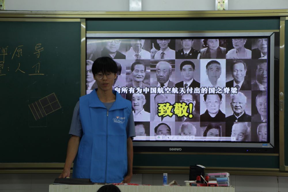 在課程開始前,志愿者先帶領學生一起朗誦《讀中國》,在那朗朗讀書聲中,向著東方喊出:我愛你中國!厚重悠長的歷史與蓬勃生機的時代力量交匯融合,共同奔向新的未來!在上課中,志愿者為學生們詳細介紹了我國的航天發展史,從天宮二號空間實驗室,到神舟十一號載人飛船再到現在空間站技術的運用。在無比浩瀚的星空里,在永無止境的探索中,踔厲奮發、勇毅前行,中國載人航天事業將不斷創造新輝煌,中國人的飛天腳步將向更加遼闊深邃的宇宙邁進。