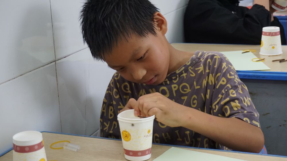 在手工實踐課上,志愿者用紙杯,皮筋,木棍等簡易材料,帶領學生們一起制作火箭模型。兩個紙杯交疊,依靠皮筋的彈力,做出飛天的效果。終于完成了,孩子們紛紛跑到教室外面,比比誰的火箭飛的高,一場如火如荼的比賽瞬間拉開序幕,校園里充滿了歡快的笑聲。將知識與實踐相結合,寓教于樂,既讓學生感受到航天精神的厚重與悠長,又在動手中進一步了解航天的相關知識,讓航天精神真正在孩子們心中生根發芽。