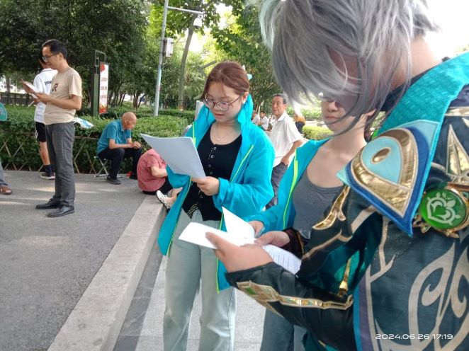 2024年6月26日,炎炬似火的夏日午后,源園公園內(nèi)熱鬧非凡。一支身穿統(tǒng)一服裝的年輕隊(duì)伍正在公園的一角忙碌著,他們就是"醫(yī)護(hù)相伴,青春不'毒'行"暑期實(shí)踐隊(duì)。