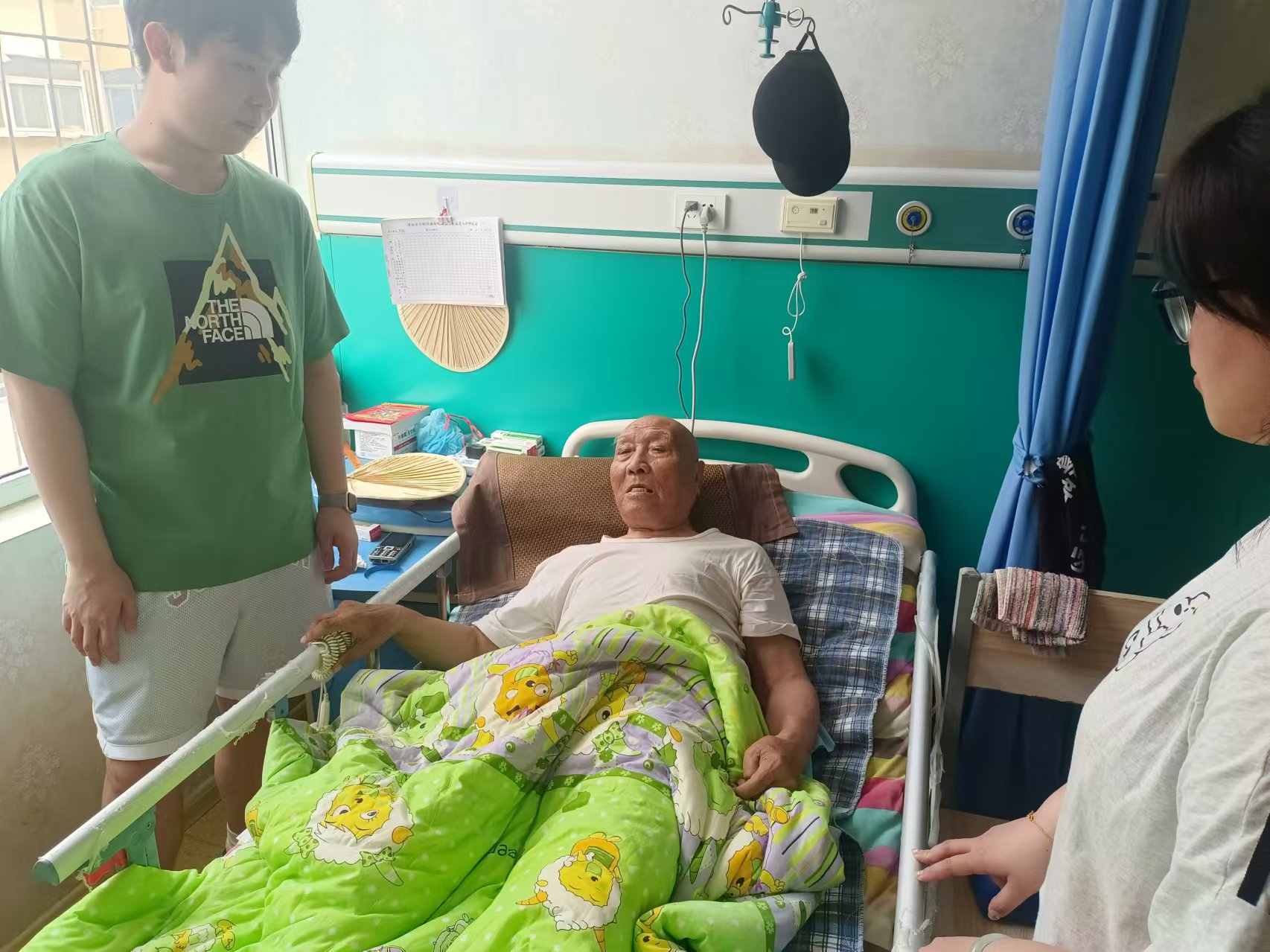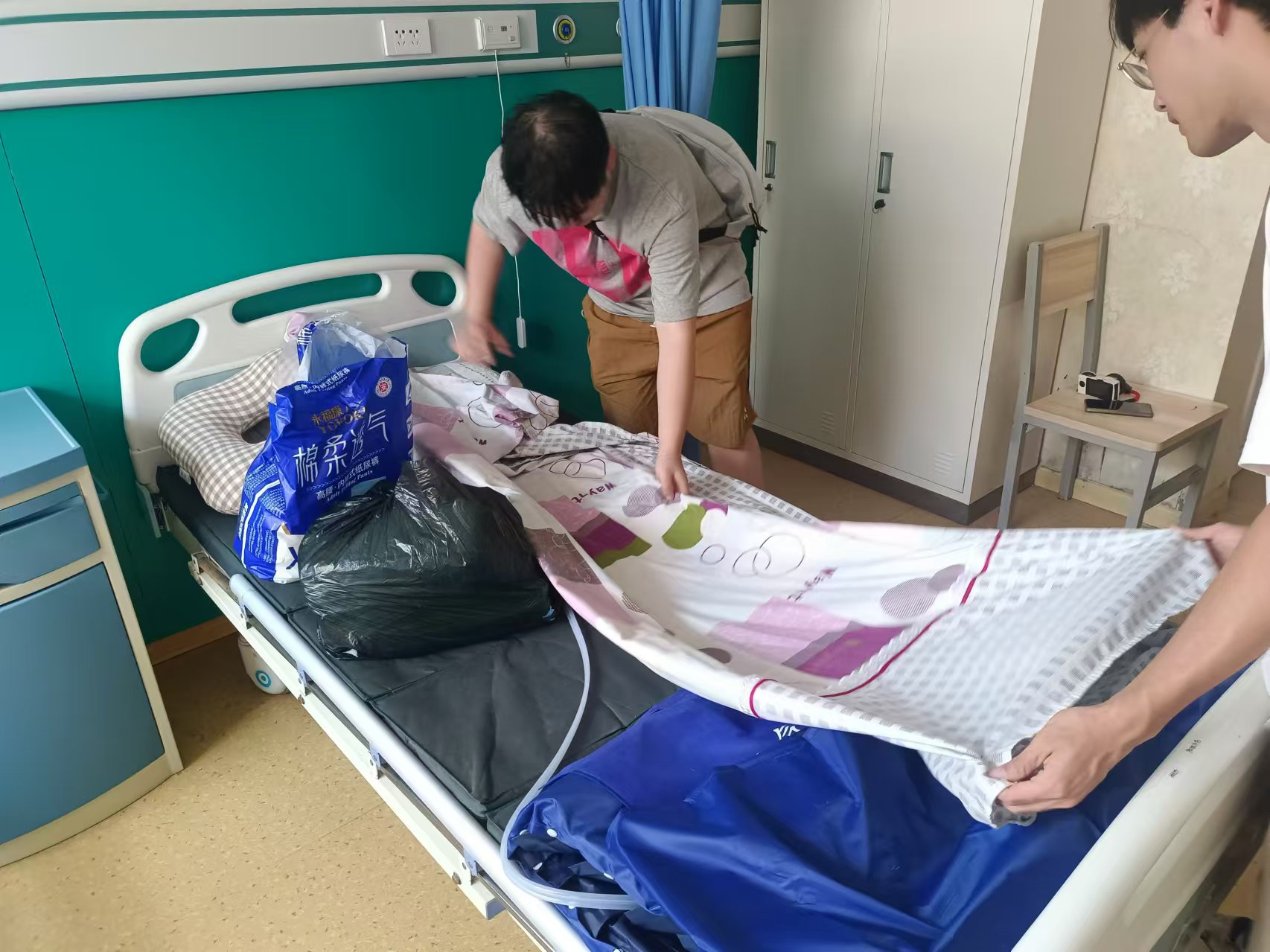 進入大門首先是一片寬闊的水泥地和一座三層的公寓小樓,負責接待的孟護工非常歡迎實踐團的到來。實踐團成員跟隨孟護工乘坐電梯到達二樓老人居住的地方,每個房間都住有兩個老人,配備相關醫療器械,大多數老人癱瘓在床,行動不便,少數老人可以依靠護工幫助進行日常的活動鍛煉。
