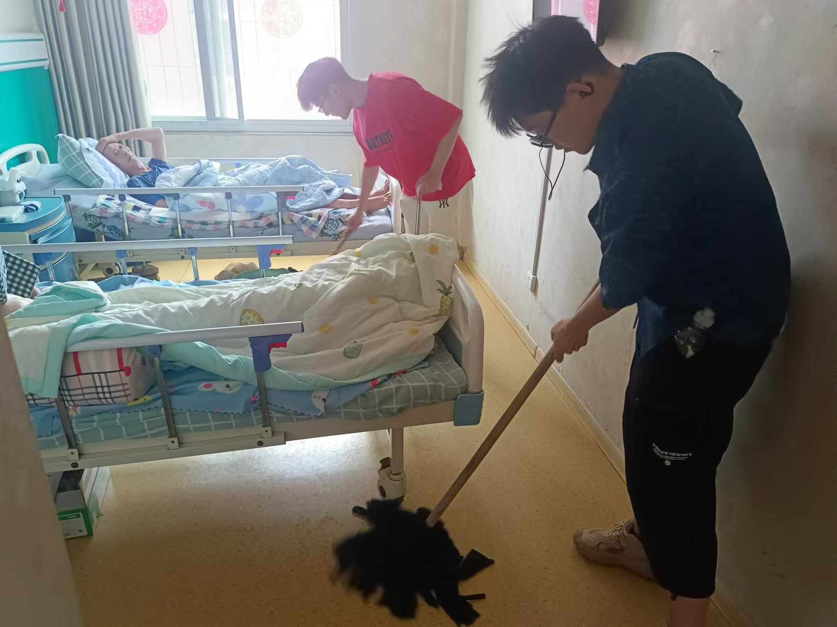 實踐團成員拿著護工分發的打掃工具,一起打掃房間內以及樓道內的地板,同時其他成員來到屋里為老人整理雜物,打掃屋內衛生,為老人們營造一個干凈舒適的生活環境。
