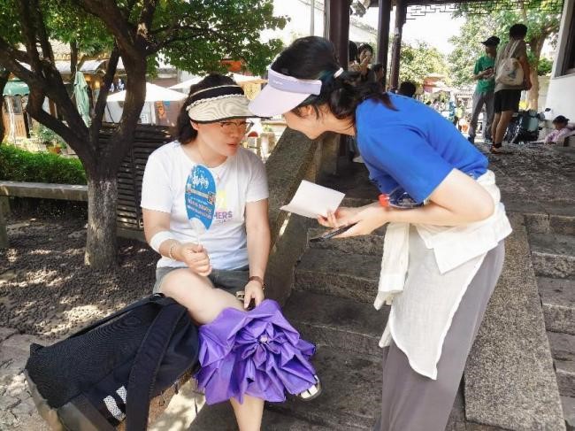 7月22日中午十點,調研小隊隨機采訪了多位游客和部分蘇州本地人。采訪內容主要包括他們對蘇州評彈的了解程度、感興趣的內容以及了解的渠道以及對評彈未來發展的期望。采訪對象覆蓋廣泛,無論是本地居民還是游客都熱情、耐心地回答采訪隊員提出的問題。