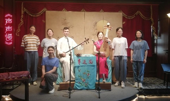 除此之外,朱怡女士還分享了自己與評彈的故事。從生發興趣到拜師學藝,從初出茅廬到爐火純青,她與評彈始終相伴,融為一體。朱怡女士的故事使調研隊員們深受感動,感受到評彈藝術在現代社會中的傳播和推廣的重要性,也為繼續深入調研蘇州評彈注入了強勁的動力。