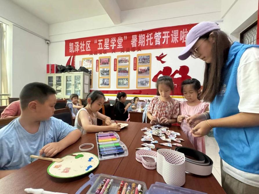 圖為實踐隊員向社區小學生教授戲曲文化的有關知識,學生們認真聽講后并親手實踐,旨在實現戲曲文化的“德”育。 李孟賽 供圖