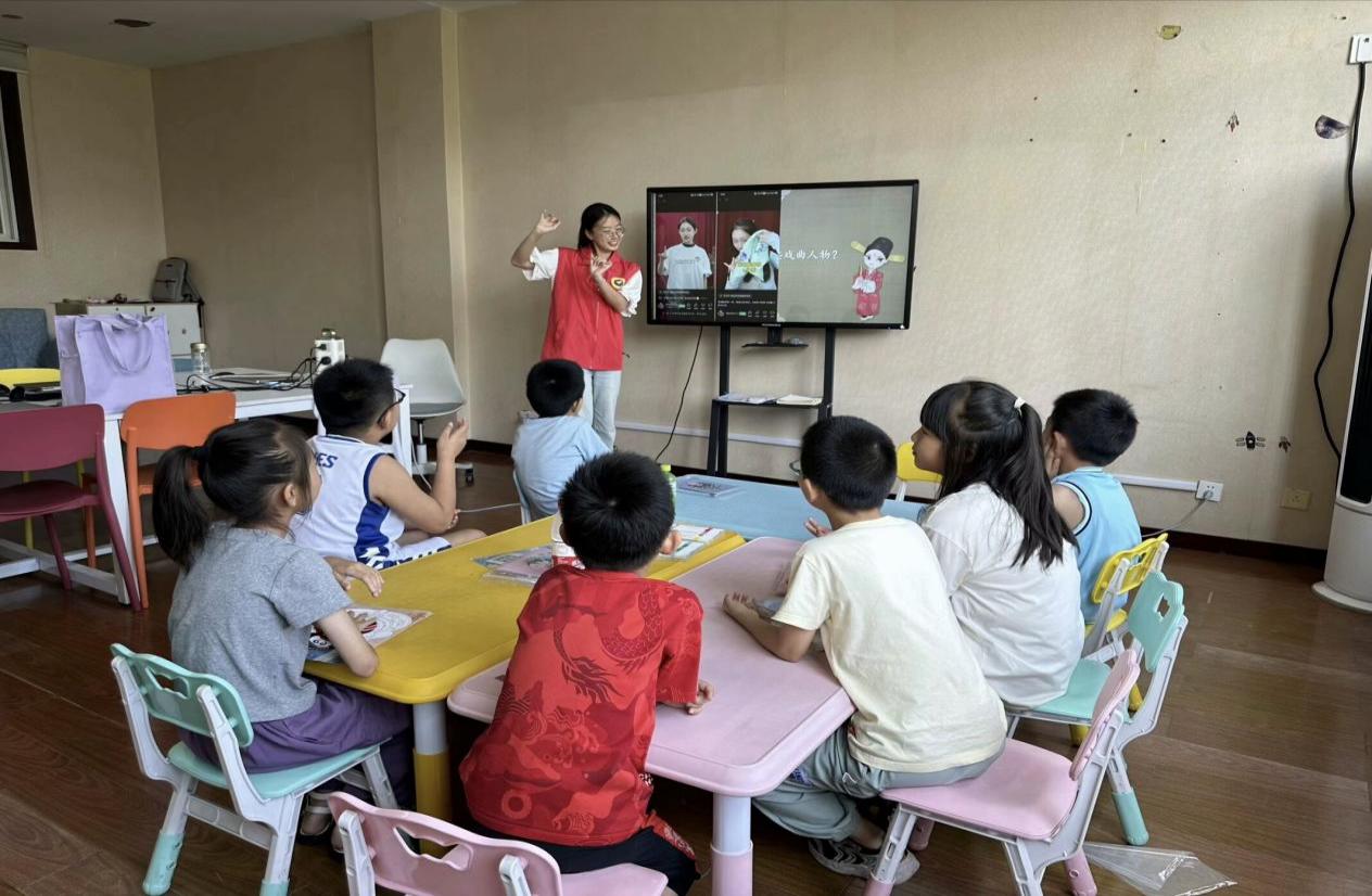 圖為實踐隊員向小朋友們介紹戲曲元素,此次折扇與戲曲相結合的教育活動,旨在將傳統文化之美和美育相結合,讓小朋友們在歡樂與探索中感受傳統文化的魅力;同時推動傳統文化的傳承與創新。高川雲 供圖