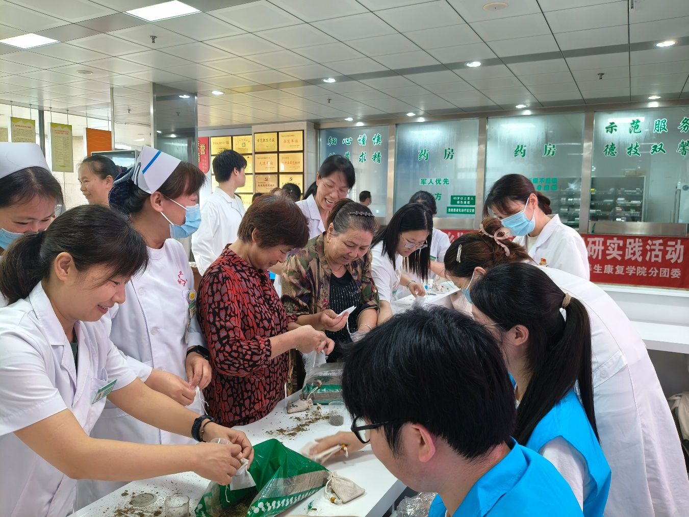 在志愿者的講解和指導(dǎo)下,現(xiàn)場的村民和醫(yī)護人員學習了解中藥香囊的主要成分和制作方法,志愿者們還現(xiàn)場講解了夏季中醫(yī)養(yǎng)生的常用知識。志愿者們還為村民們提供了推拿、沖泡花茶和制作漆扇等服務(wù),活動現(xiàn)場氣氛熱烈,村民們參與熱情高漲。