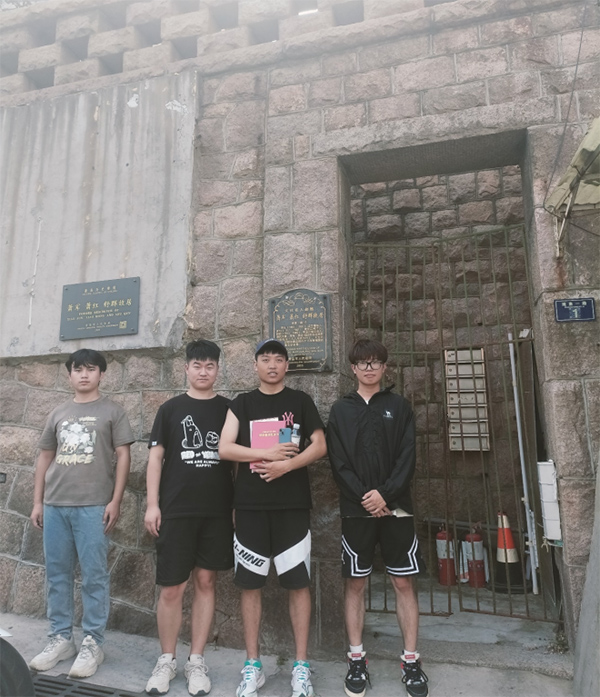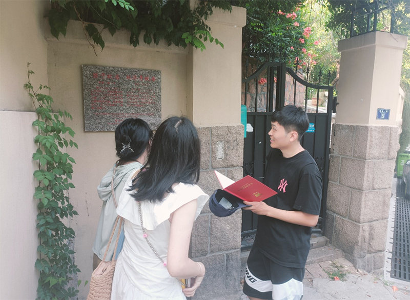 實踐隊首先來到蕭紅、蕭軍、舒群故居,這是一座通體以花崗巖砌成的二層紅瓦小樓。故居門旁的展板介紹了這幾位文化名人的生平與成就。蕭軍著有《八月的鄉村》,被譽為“民國四大才女”之一的蕭紅在該寓所寫下了著作《生死場》,舒群在青島創作了《沒有祖國的孩子》。他們駐足于每一件展品前,從手稿、書籍到生活用品,每一處細節都透露出三位作家曾經的生活軌跡與創作激情。
