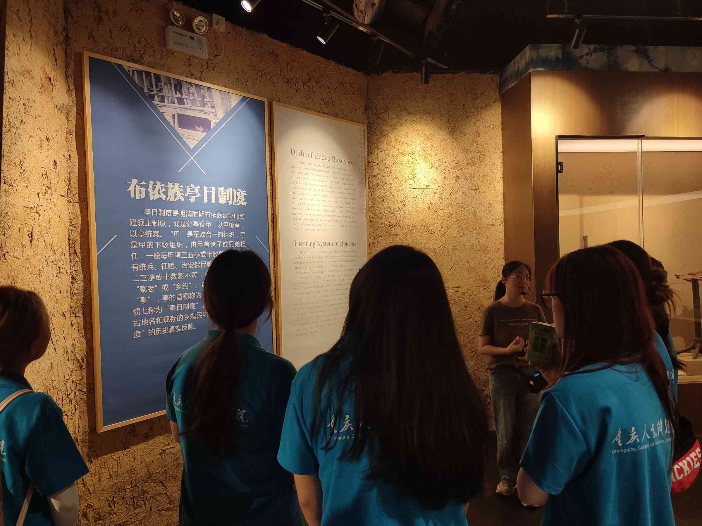 在參觀過程中,實踐團成員認真聆聽相關講解介紹,仔細觀察展品。講解員詳細介紹了布依族的民族服飾,展示了布依族服飾的多樣性和獨特性,包括色彩斑斕的刺繡、精致的銀飾以及傳統的頭飾等,讓實踐團成員對布依族的服飾文化有了直觀的認識。隨后,講解員帶領成員了解了布依族的亭目制度,這是一種獨特的社會組織形式,體現了布依族人民的智慧和團結精神。在布依族建筑展區,如木結構的精巧、屋頂的獨特造型以及建筑與自然環境的和諧統一,實踐團成員們對布依族的建筑藝術贊嘆不已。