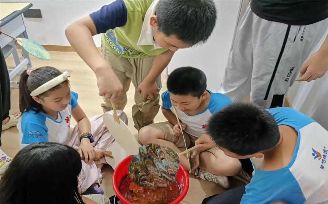 傳承扇藝,繪夢童心。為弘揚與傳承中華優秀傳統文化,“智慧菜園”暑期社會實踐團的志愿者們為孩子們帶來了一場藝術與文化相交織的漆扇DIY活動。“非遺漆扇是一項水與大漆的藝術,以漆為媒,以扇為紙,最早可以追溯到東漢時期……”從漆扇的起源到色漆搭配推薦,再到“垂直入水”“傾斜式入水”“旋轉入水”“Z型入水”等專業上色手法介紹,實踐團成員耐心地講解了漆扇的制作步驟和注意事項,孩子們的眼里也愈發閃爍著躍躍欲試的期待。在上手環節,孩子們跟隨實踐團成員的介紹,將稀釋好的色漆小心翼翼地滴灑在水面上進行設計制作。漆彩調色,紙扇入水;逸態橫生,濃姿百出,一幅幅精美的漆扇作品在孩子們的手中誕生。它們或簡約大方,或色彩斑斕,每一把都蘊含著孩子們獨特的創意和純真的情感。