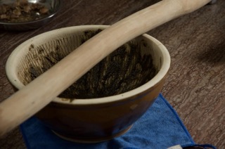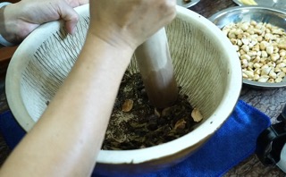 - 把細茶、生姜、小葫、茴香、八角、沙仁、果皮搗爛拌勻