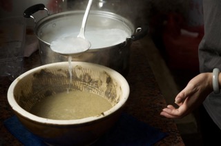 茶洞擂茶粥選料有:田糙米、細青茶、生姜、小葫、八角、砂仁、陳璘皮、茴香、炒熟去衣的花生仁、花生油、食鹽、山泉水等。