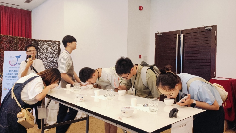 在Chiang Mai Highlands Golf & Spa Resort,實(shí)踐團(tuán)隊(duì)參觀了ICP-THAI GREEN COFFEE EVALUATION 2024(泰國(guó)咖啡評(píng)級(jí))活動(dòng)。嚴(yán)謹(jǐn)?shù)目Х仍u(píng)級(jí)過(guò)程展現(xiàn)了專(zhuān)業(yè)評(píng)鑒師們對(duì)咖啡品質(zhì)的嚴(yán)格標(biāo)準(zhǔn)和深厚的專(zhuān)業(yè)素養(yǎng),團(tuán)隊(duì)成員結(jié)合之前學(xué)習(xí)的理論知識(shí),對(duì)咖啡的復(fù)雜評(píng)判體系有了更深刻的理解。