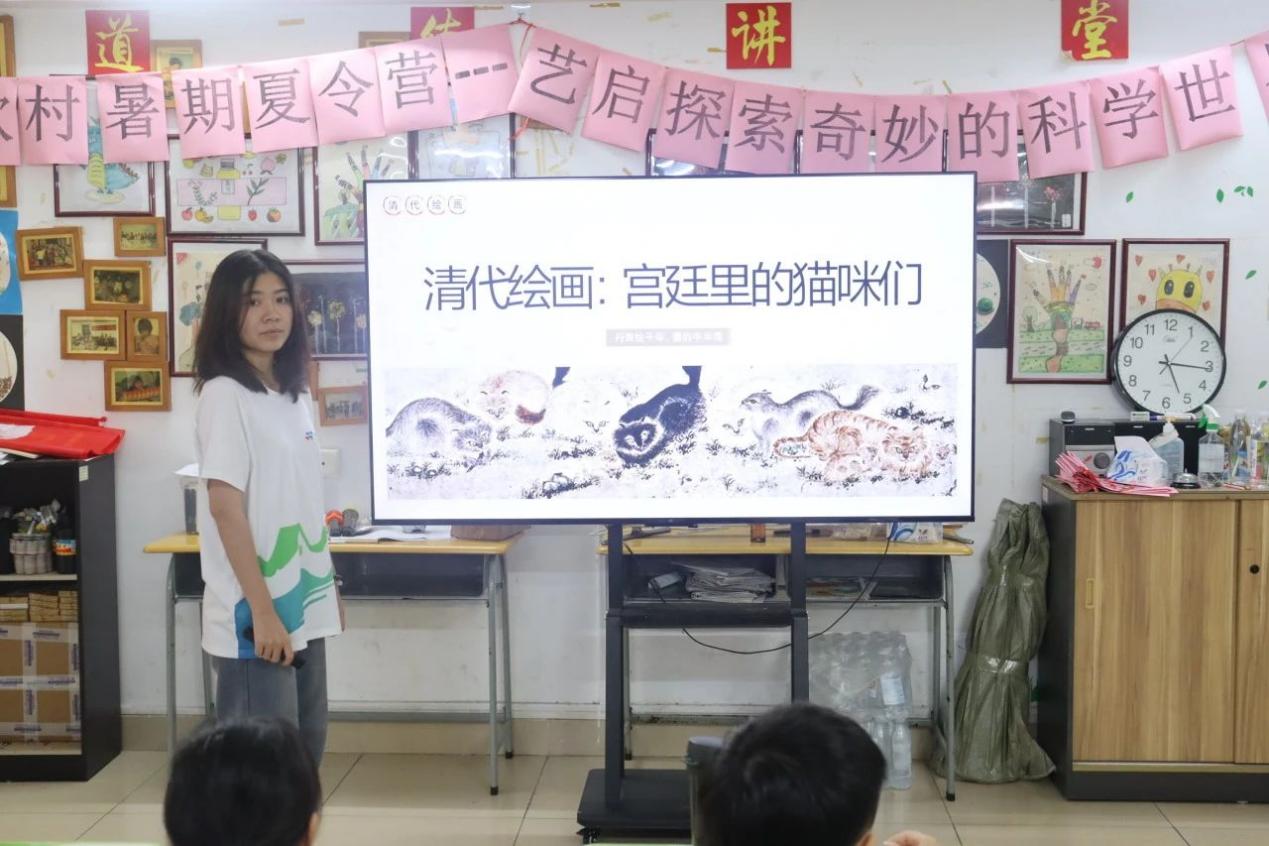 中國古代繪畫鑒賞“丹青繪千年,墨韻中華情”志愿宣講團楊芷欣向在場的青少年介紹四洋畫家之一艾啟蒙的動物畫《貍奴影》冊頁。