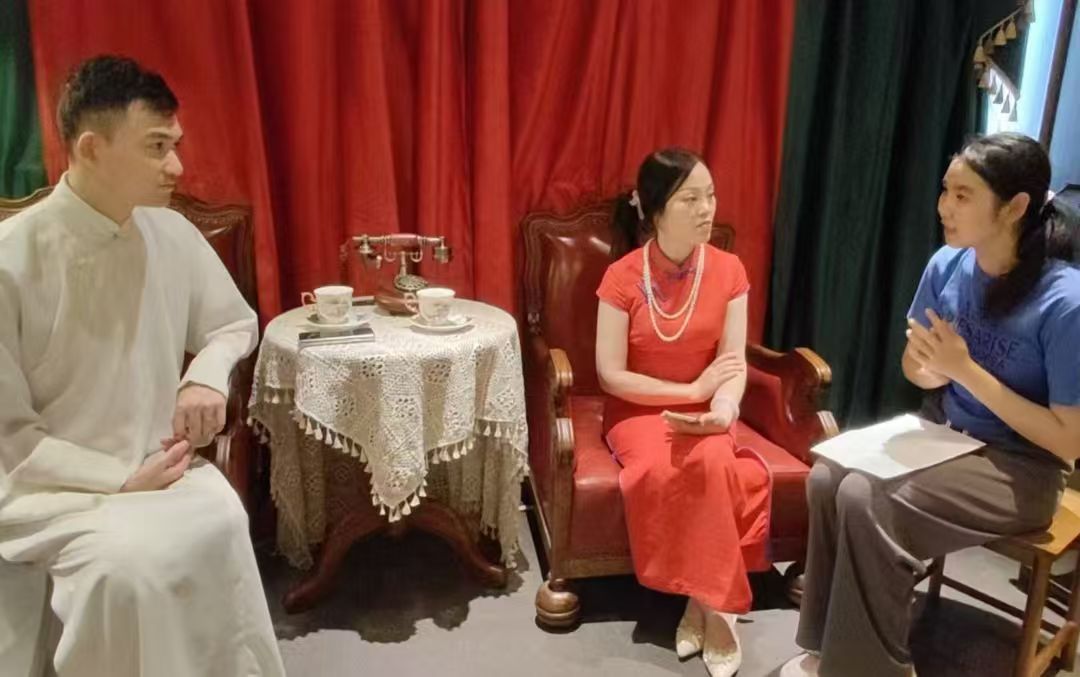 作為調查的補充,調研小隊還分別于蘇州平江路的月出·半遮面評彈館和蘇州市工業園區荷韻社區的荷韻書場進行表演欣賞。盡管部分方言唱詞對小隊成員來說存在一定理解障礙,但老師們婉轉悠揚的唱腔和生動傳神的演繹仍讓調研小隊深刻感受到了評彈藝術的古典韻味與強大生命力。隊員們還采訪了幾位資深評彈演員——徐文龍老師、朱怡老師,并與在荷韻書場演出的蘇州市評彈學校的楊柳老師及學生們進行了面對面的交流。