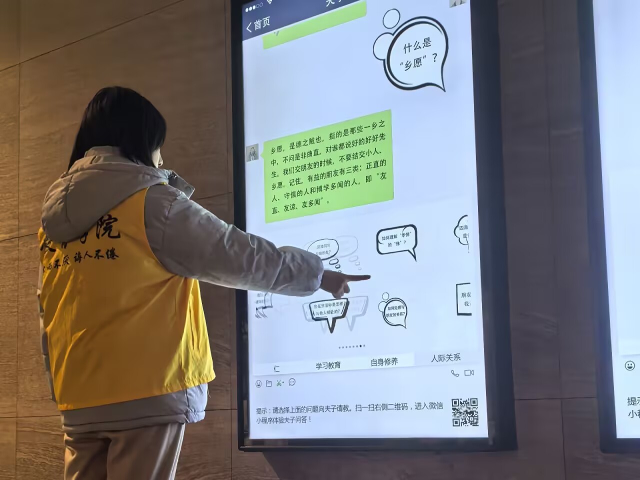 對話孔子,汲取古老智慧的精神滋養實踐隊使用孔子博物館中陳列的“夫子問答機器”來與孔子對話,聆聽來自古老優秀文化的教誨,實踐隊表示:“儒家文化的智慧如同隱匿在道德花園中的密封,悄無聲息地傳播著著社會的公序良俗,持續為我們指引著為人處世、安身立命的方向,成為推動社會不斷進步與發展的強大精神動力。“