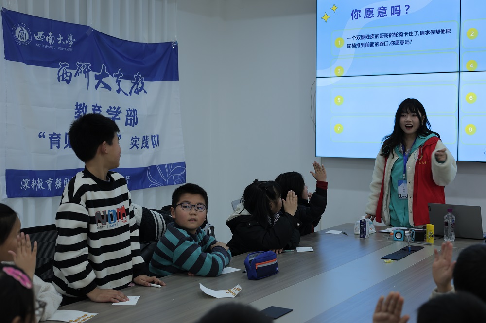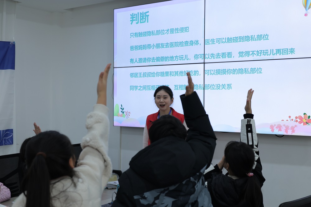 防性侵害教育環節中,考慮到小學生的認知特點,實踐隊員采用情景模擬、角色扮演等形式,用簡單易懂的語言向孩子們傳授如何分辨性侵害行為、如何保護自己的隱私部位等關鍵知識。孩子們認真投入,在模擬場景中學會了勇敢地對不當行為說“不”,切實提高了自我防范意識。