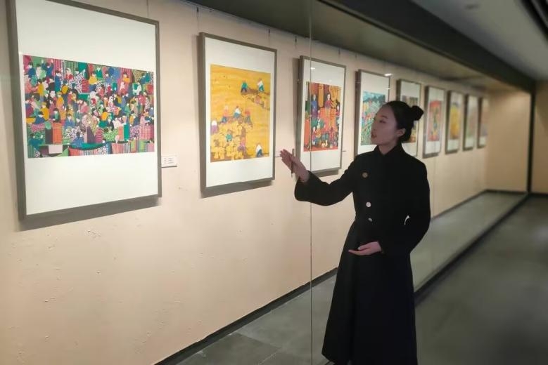 隊(duì)員們有幸見到了農(nóng)民畫傳承人厲名雪老師。厲名雪老師現(xiàn)場(chǎng)展示了農(nóng)民畫的創(chuàng)作過程,從構(gòu)思草圖到上色定稿,每一個(gè)步驟都飽含著心血。成員們紛紛拿起畫筆,在老師的指導(dǎo)下嘗試創(chuàng)作。隊(duì)員尚瀅感慨道:“之前只是在書本上了解農(nóng)民畫,這次親手繪制,才深刻體會(huì)到它的魅力。每一筆色彩都承載著日照人民對(duì)生活的熱愛。”圖為實(shí)踐隊(duì)成員欣賞農(nóng)民畫