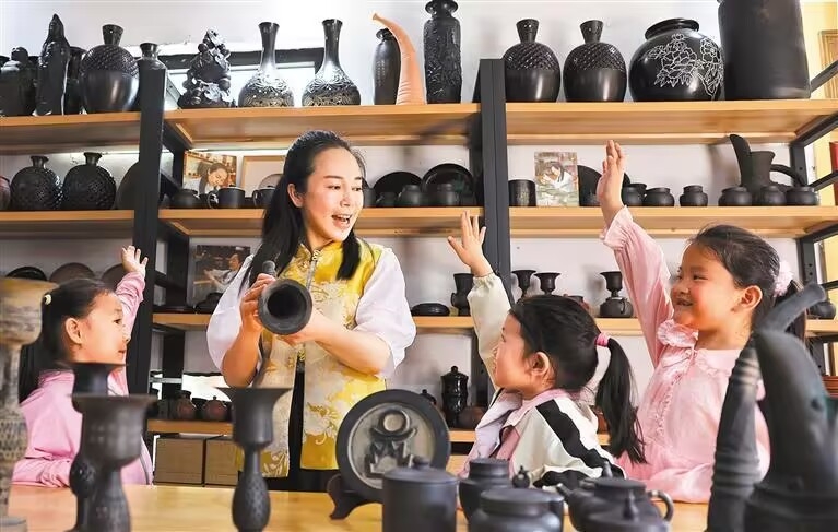 圖為小學(xué)生與黑陶展品的互動(dòng)圖為傳承人在制作黑陶