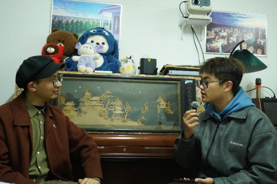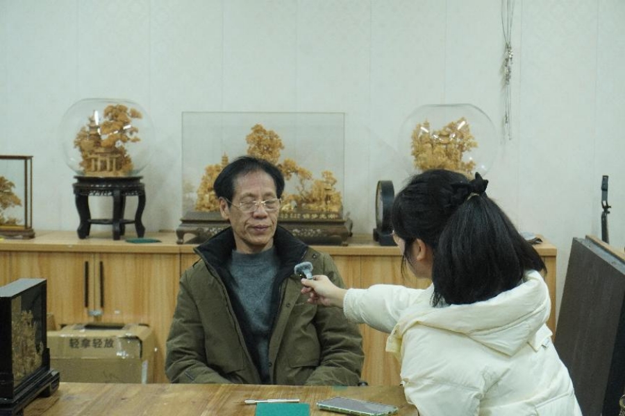 圖為實踐隊隊員與軟木畫非遺技術傳承人陳君琨先生深入訪談,探索非遺文化的現代傳承。江怡瑩 供圖