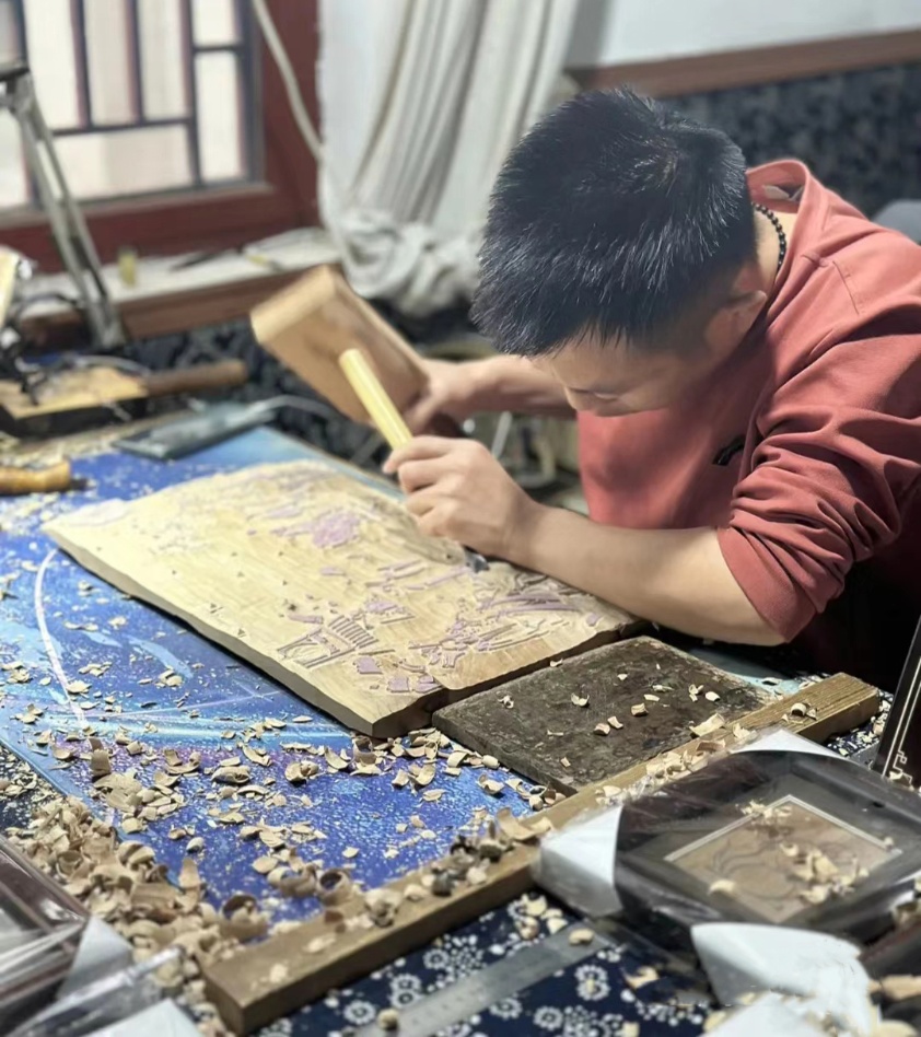 在木版年畫的制作工坊,實踐隊有幸采訪到了非遺傳承人楊穎偉大師。楊大師專注于手中的刻刀,在梨木板上精雕細琢,木屑紛紛揚揚,人物的眉眼、服飾的紋理漸漸清晰。他停下手中的工作,語重心長地說道:“這木版雕刻,講究的是心手合一,力度和角度的微妙把握,才能刻出靈動的線條,完成一塊版常常需要耗費一個月甚至更久的時間。” 談及傳承,他的眼神中透露出堅定與執著:“這門技藝在家族中傳承了數百年,承載著先輩的心血與期望。就像我為 2008 年奧運會創作的‘福娃’木版年畫觀賞版,就是想讓傳統與現代碰撞出火花,吸引更多年輕人關注這古老的藝術。”