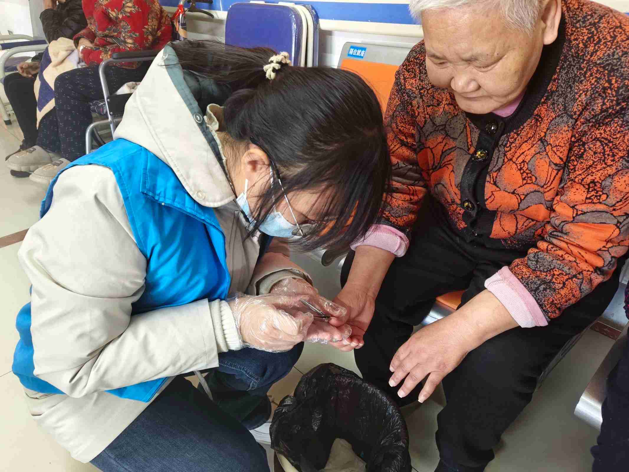 實踐隊員小心翼翼地打開指甲剪,左手輕輕捏住奶奶大拇指的指甲兩側,右手穩穩地握住指甲剪,將剪口對準指甲邊緣。隊員的動作格外輕柔,生怕稍微一用力就會弄疼奶奶。“咔嚓” 一聲,一小截指甲緩緩落下,聲音在安靜的室內格外清晰。實踐隊員謹慎地調整角度,一點點地將嵌入肉里的指甲挑出來,再慢慢剪掉。每一個細微的動作都傾注了滿滿的關懷。隨著一個個指甲被修剪整齊,奶奶的手看起來清爽了許多。在實踐隊員們給奶奶們剪指甲時,奶奶們不停的說:“剪得好著嘞,好著嘞。”