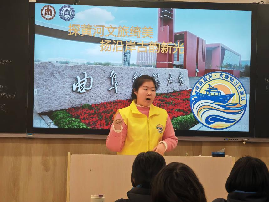 面向七年級學生,實踐隊隊員利用英語專業優勢,針對黃河文化概況介紹和鄭州已有文旅項目兩部分進行雙語課堂宣講。