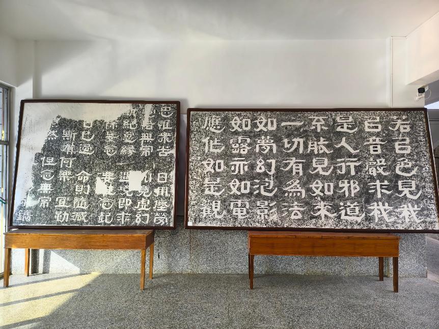 第二站便是法相巖摩崖石刻。法相巖在武岡城南五里許,是一座石山,南側由西南方到東北方是一道摩崖鐫刻長廊,高一至二丈,長四五十丈,中間略有缺處。嶙峋的石山下共有互相連通的八個巖洞,八個巖洞各有名稱。其中最令隊員們難忘的是《金剛經》偈語石刻,蘊含著篆書與隸書結合在一起的巧妙,形成了獨特的書法風格。受感染至深,隊員們紛紛拍照留存、記錄感想。