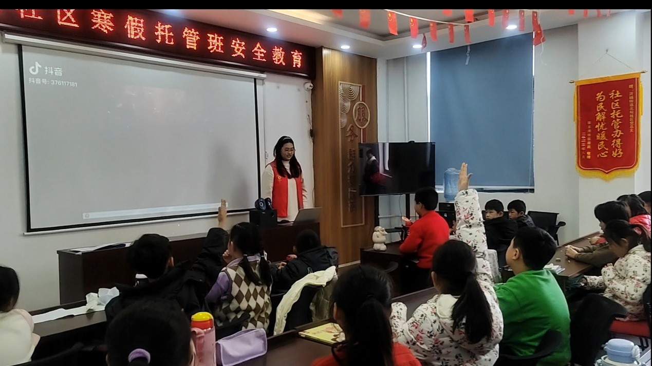 在開課期間,隊員郭宜璇作為大學(xué)生代表為孩子們開展2025年北壇社區(qū)寒假安全教育課,以精心制作的PPT為載體,向托管班的學(xué)生們深入淺出地講解煙花禁燃、防火、防溺水、防欺凌等安全教育知識。考慮到孩子們活潑好動、注意力易分散的特點,她在講解過程中穿插播放了趣味十足的動畫短視頻,生動展示了火災(zāi)與溺水事故的危害,吸引孩子們的注意力。不僅如此,還通過隨堂提問的方式,激發(fā)孩子們的學(xué)習(xí)興趣,引導(dǎo)他們積極思考,主動參與到安全教育中來。提問過程中現(xiàn)場氣氛熱烈,孩子們積極舉手回答問題。