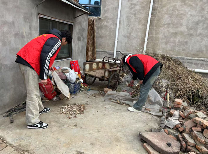 (圖為大學(xué)生協(xié)助村委會(huì)清理獨(dú)居老人的家 張碩坤供圖)