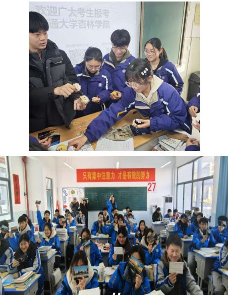 本次活動分為四個部分,第一部分“‘杏’光引航,夢想續航”團隊成員定制精美的學校文創并邀請大學生們寫下高考勵志語錄,傳遞溫暖與力量。第二部分“情牽母校,守護心靈”團隊成員利用課間發放高中生心理調查問卷,與高中生們深入交流,傾聽他們的心聲。第三部分“杏韻啟新程,逐夢正當時”團隊成員通過宣傳PPT簡要從學校概況、師資力量、校園活動、招生政策等方面介紹我院,鼓勵他們在高中階段守住初心、努力學習。第四部分“學路反哺,薪火共燃”團隊部分成員返校支援教學工作,承擔期末考試監考任務,協助教室整理檔案,收獲了老師與學生們的一致好評。