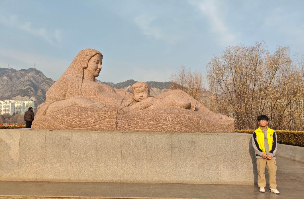 上午9點,隊員準時到達黃河母親雕塑所在地。冬日的寒風雖凜冽,但眼前這座聞名遐邇的雕塑卻散發著溫暖而強大的文化力量。雕塑中,母親側臥,神態溫柔慈愛,她微微隆起的腹部,孕育著生命的希望;懷中的幼嬰天真無邪,正愜意地享受著母親的呵護。這一畫面,生動地展現了黃河母親滋養華夏兒女的深厚寓意,隊員站在雕塑前,久久凝視,仔細研讀一旁的介紹牌,上網查閱資料,深入了解雕塑的創作背景、藝術特色以及背后所承載的黃河文化內涵,并在隨身攜帶的筆記本上記錄下自己的感悟。