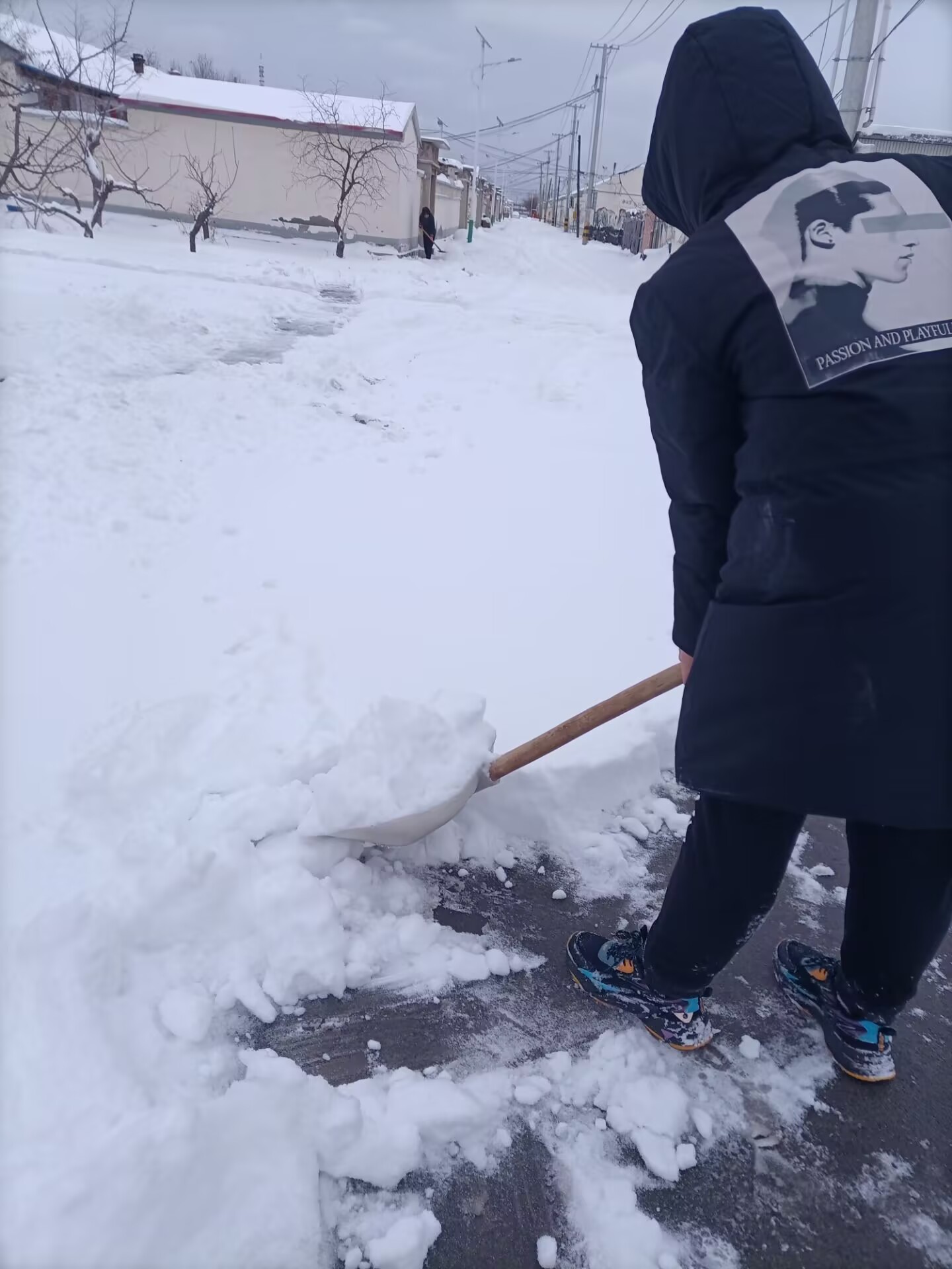 在社區的道路上,志愿者們手持鐵鍬、掃帚等工具,分工明確,有的負責鏟除厚厚的積雪,有的負責清掃殘留的薄冰,還有的負責將鏟除的雪堆放到指定位置。盡管天氣寒冷,但他們的熱情絲毫不減。經過幾個小時的努力,社區的主要道路被清理得干干凈凈,居民們可以安全地出行了。